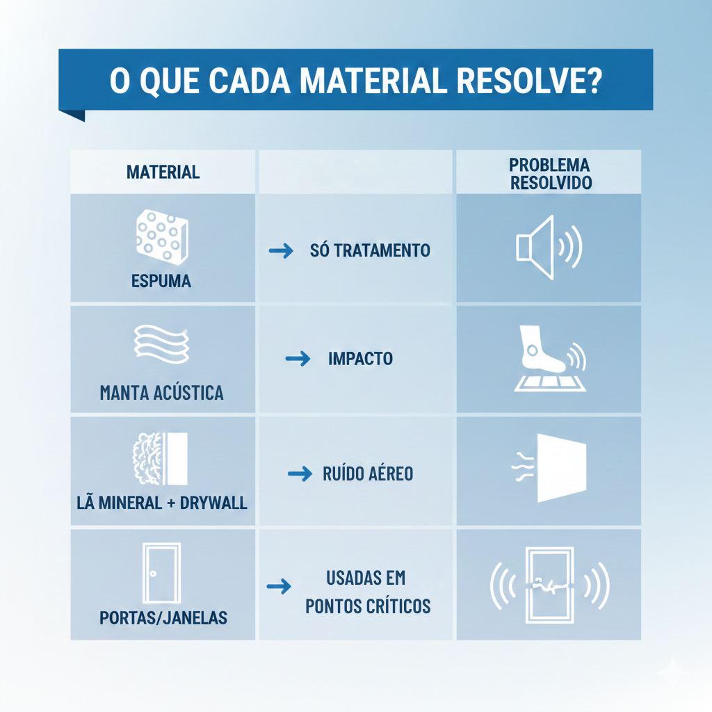 Antes de falar dos materiais, é essencial saber que isolar não é absorver. Espumas acústicas, por exemplo, são excelentes para reduzir eco dentro do ambiente, mas não impedem o barulho de entrar ou sair.