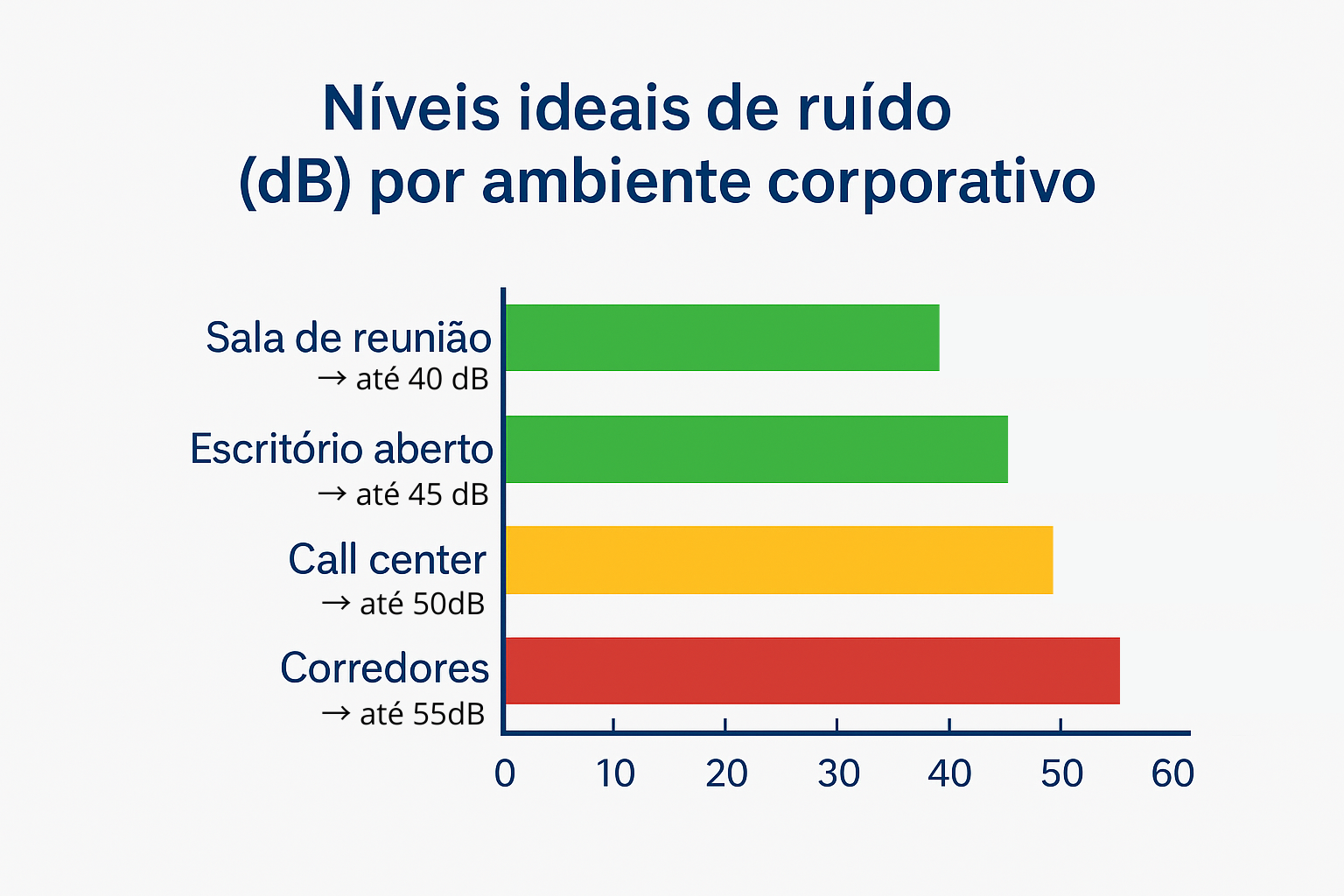 - Ruído: é o som indesejado que vem de fora (como trânsito, corredores ou outras salas) ou de dentro (equipamentos, ar-condicionado, conversas paralelas).